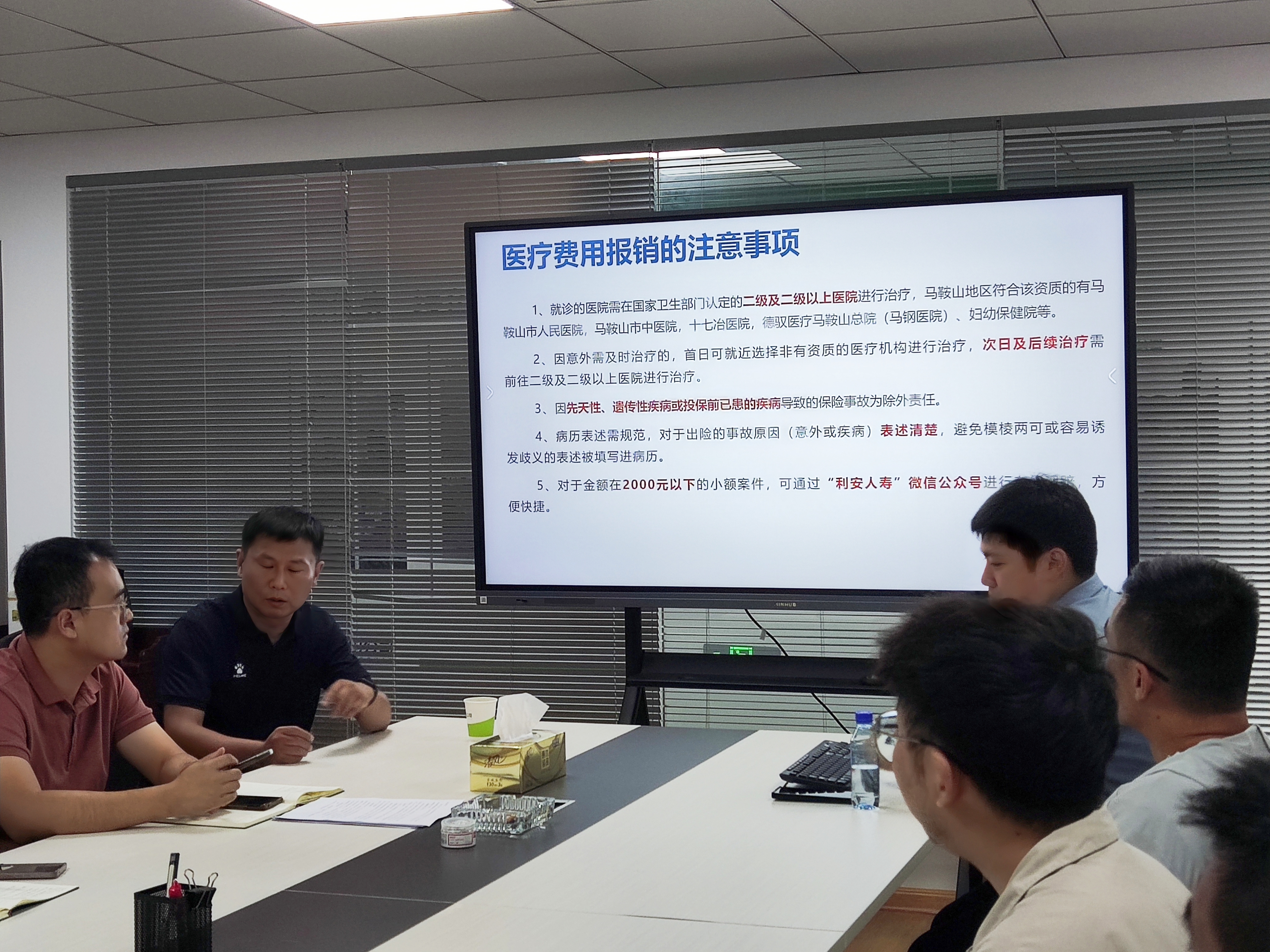 根据活动安排,利安人寿马鞍山中支团体业务部,围绕企业职工补充医疗保险方案,对保险内容和理赔常见问题进行了详细解读。
